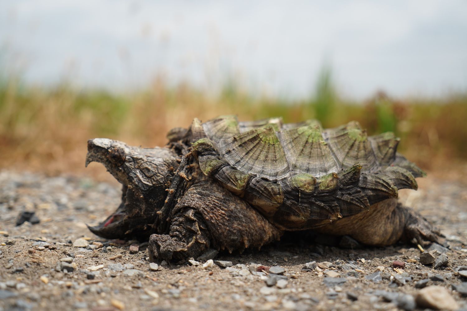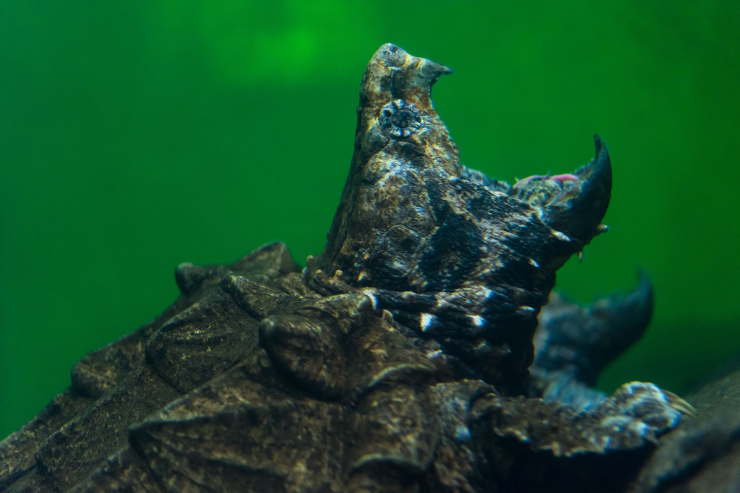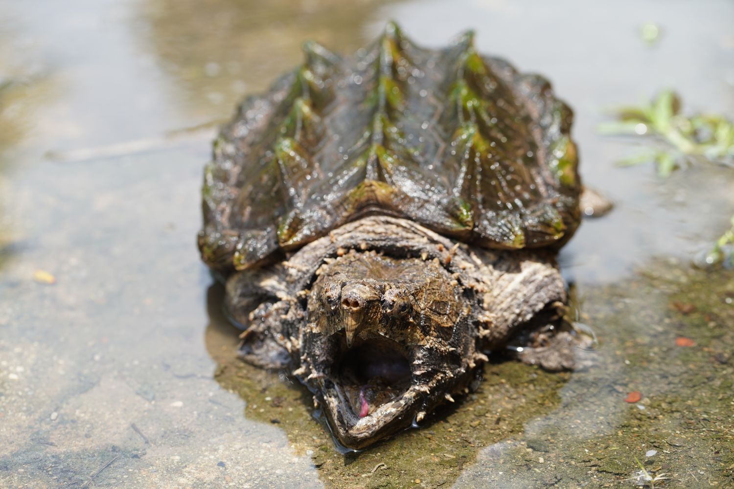It has a thick shell with three distinct ridged spikes running along the back (carapace). These raised ridges and a camouflage of algae growing on its shell help it blend into murky waters. The turtle’s head is large and triangular with a strong, hooked beak. Its jaws are extremely powerful, capable of snapping through tough materials with ease. Unlike most turtles, it cannot fully retract its head into its shell, but it compensates with bony protective eyelids and fleshy, frilled skin that give it a prehistoric visage. This turtle’s coloration and texture help it hide exceptionally well.
