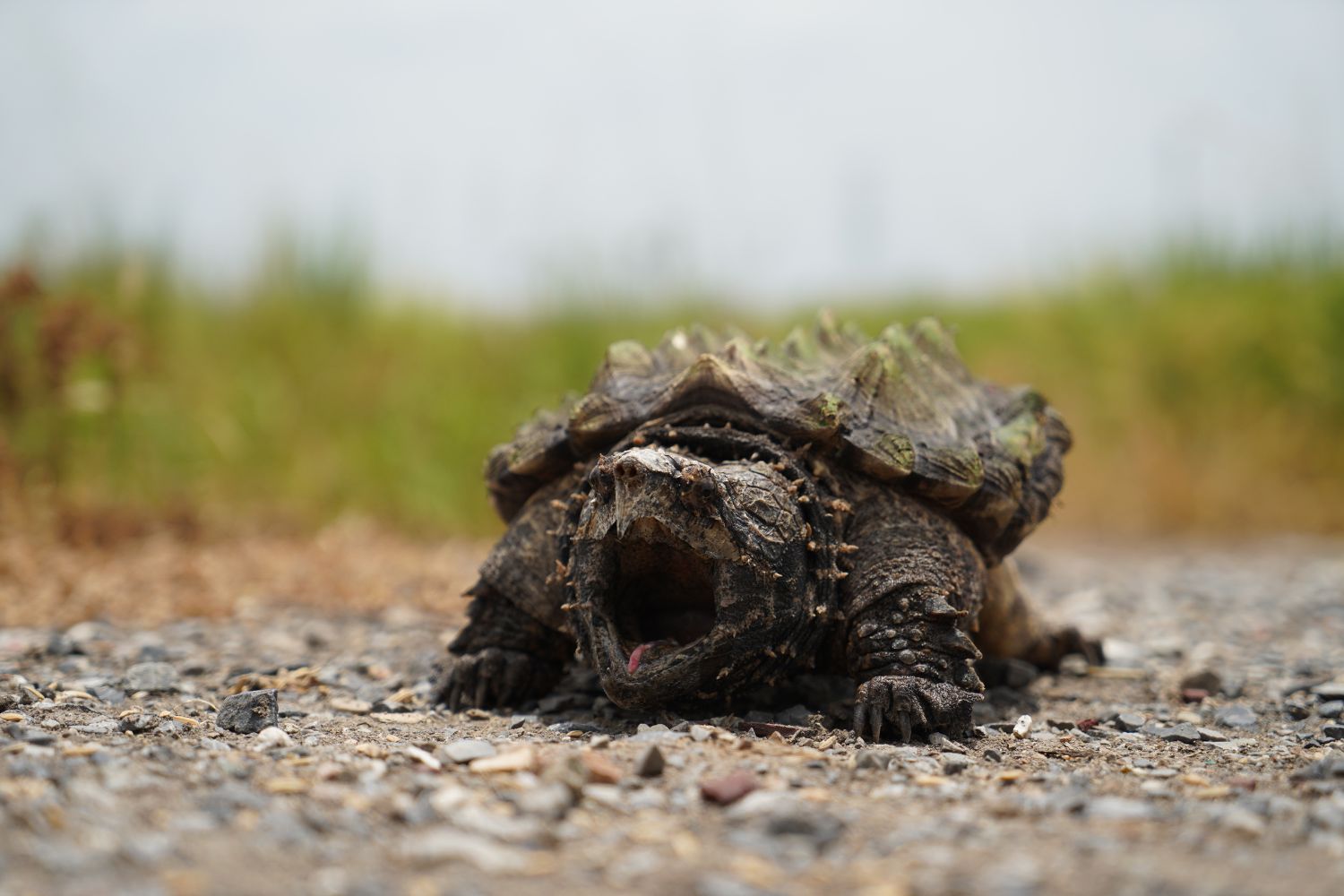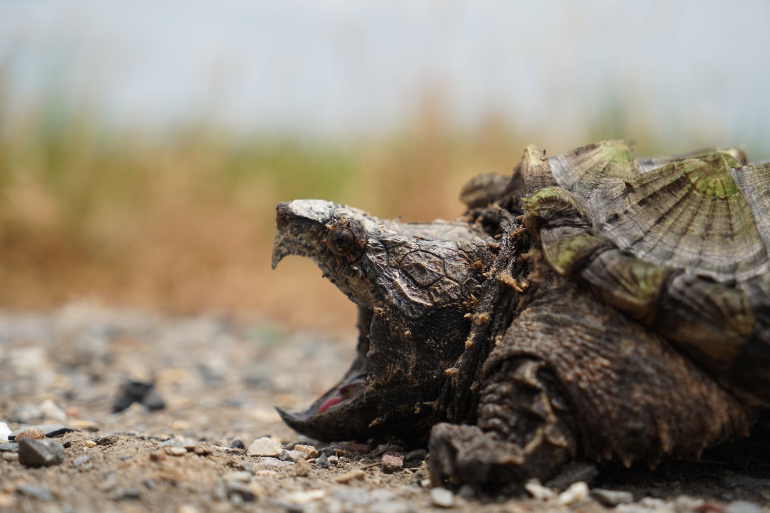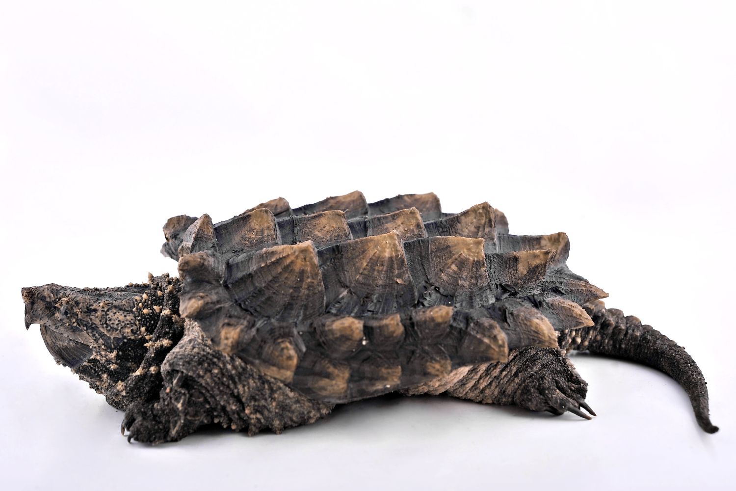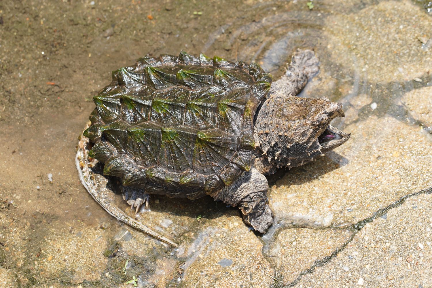 It has a thick shell with three distinct ridged spikes running along the back (carapace). These raised ridges and a camouflage of algae growing on its shell help it blend into murky waters. The turtle’s head is large and triangular with a strong, hooked beak. Its jaws are extremely powerful, capable of snapping through tough materials with ease. Unlike most turtles, it cannot fully retract its head into its shell, but it compensates with bony protective eyelids and fleshy, frilled skin that give it a prehistoric visage. This turtle’s coloration and texture help it hide exceptionally well.