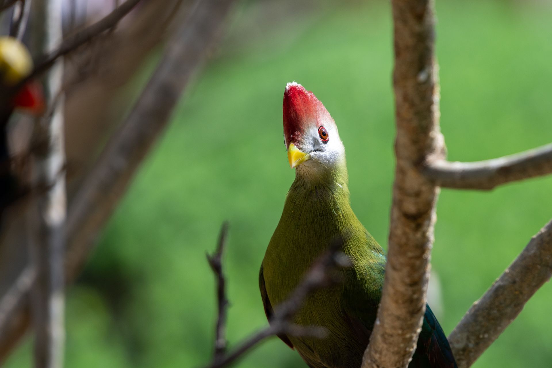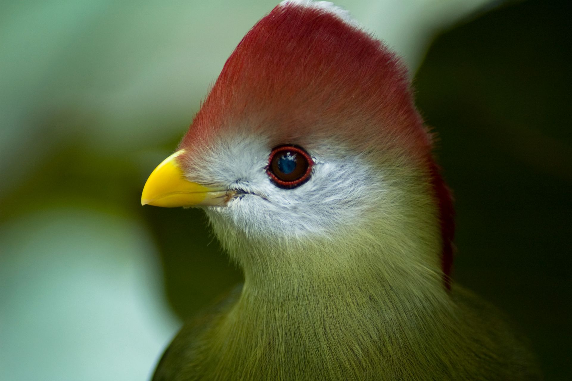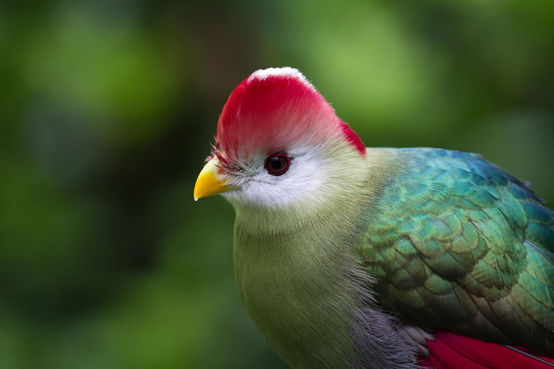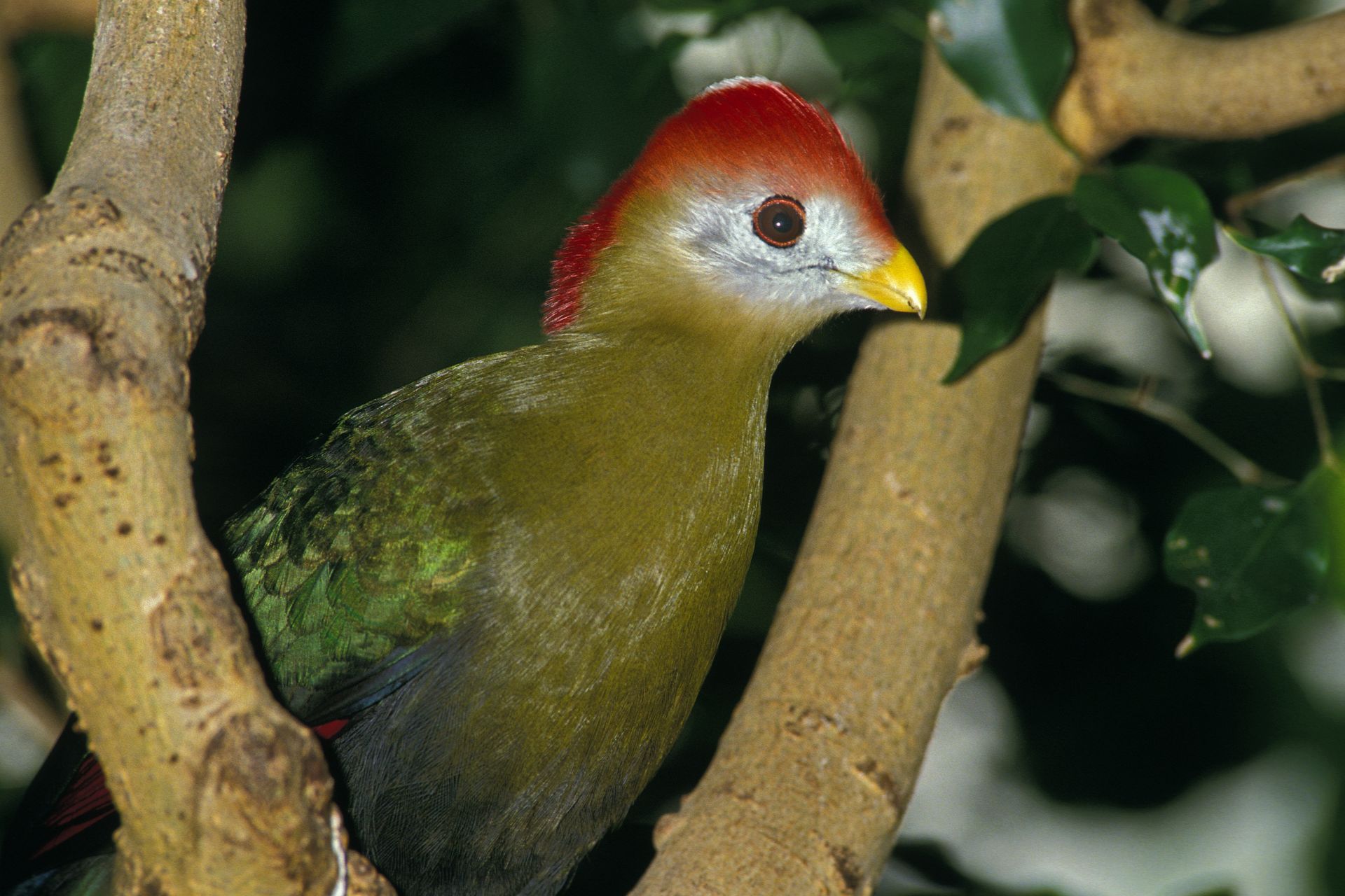 The red-crested turaco (Tauraco erythrolophus) is a brightly colored African bird endemic to western Angola. It belongs to a family of birds known for loud calls and vivid plumage, and, true to its name, it sports a red crest atop its head. It has a green body, a white face, and a yellow bill.