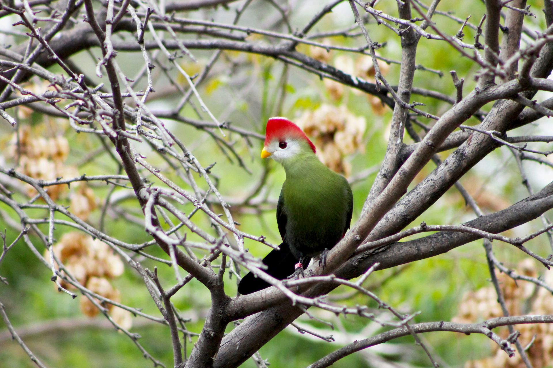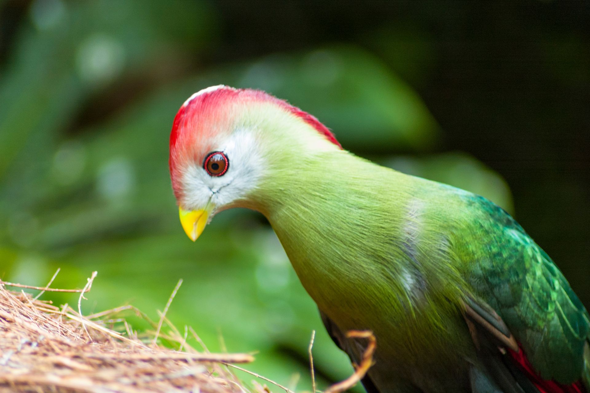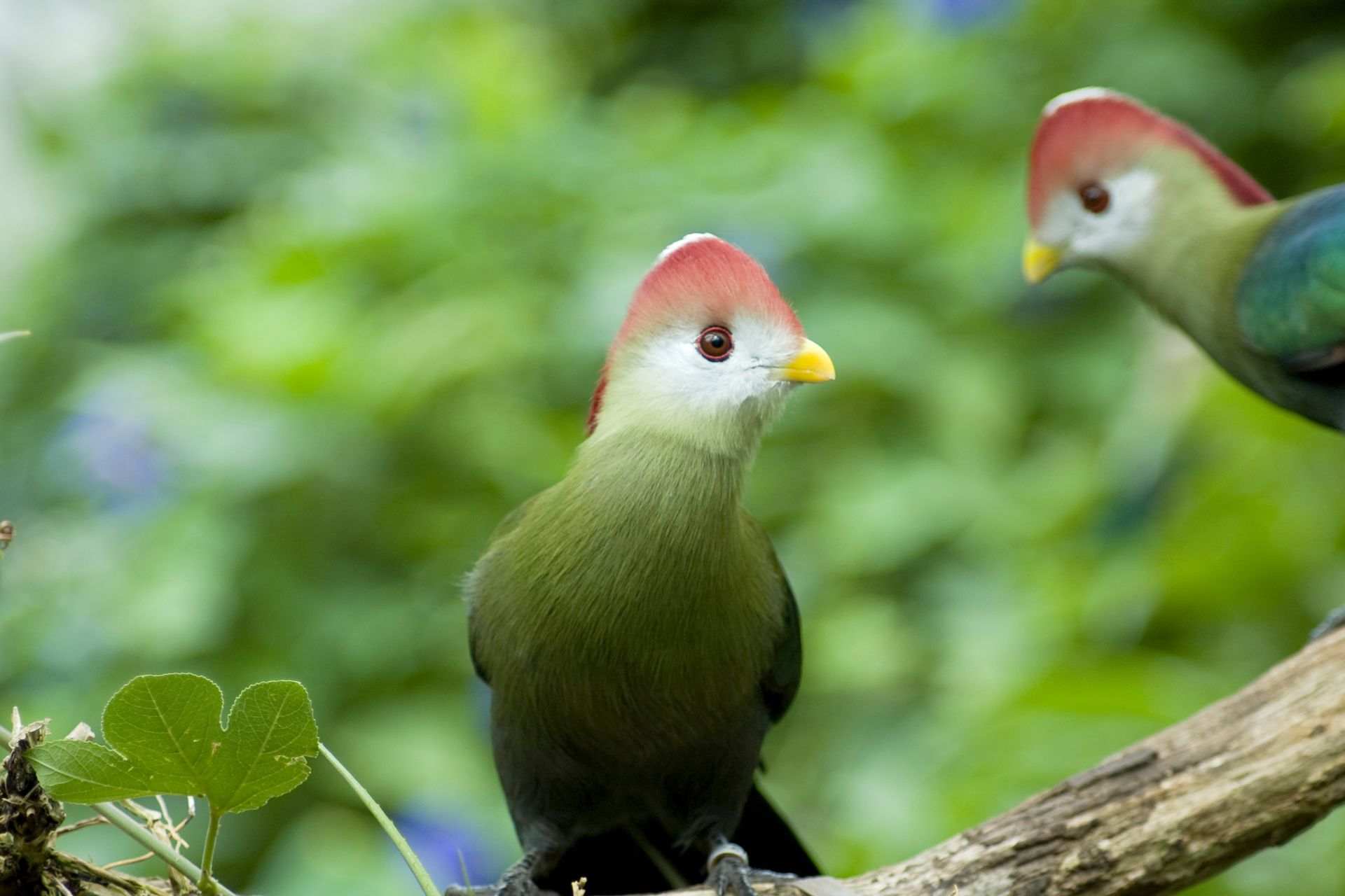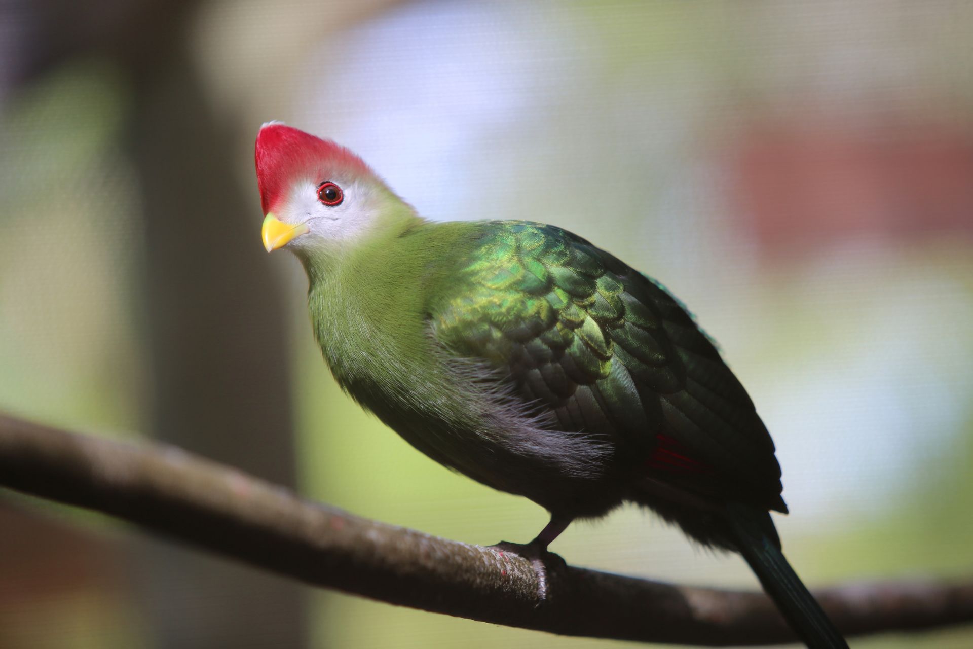The red-crested turaco (Tauraco erythrolophus) is a brightly colored African bird endemic to western Angola. It belongs to a family of birds known for loud calls and vivid plumage, and, true to its name, it sports a red crest atop its head. It has a green body, a white face, and a yellow bill.