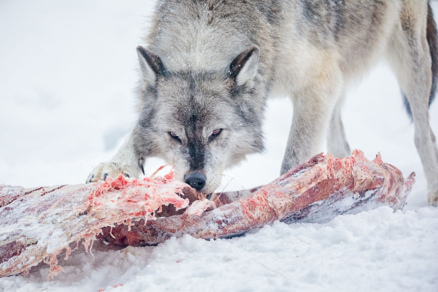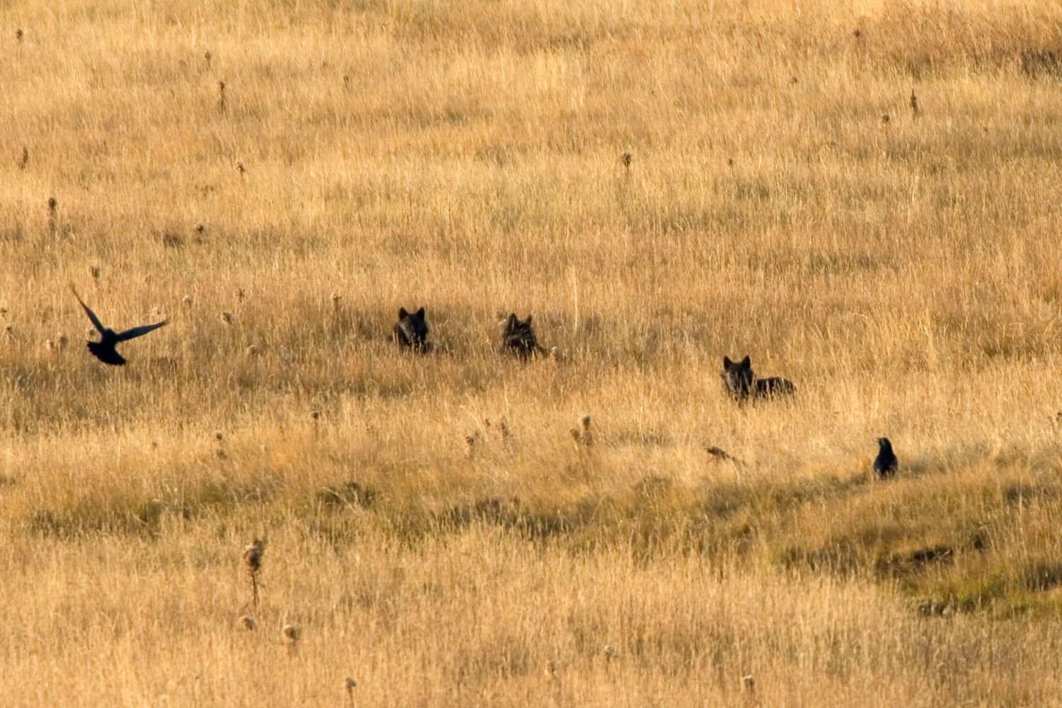 One Yellowstone carcass was mobbed by as many as 135 ravens at once. These birds dive right in, tearing and pecking at the remains alongside the wolves. Ravens will eat their fill and even cache (store) extra meat for later, sometimes carrying off chunks of flesh while the wolves are still present.