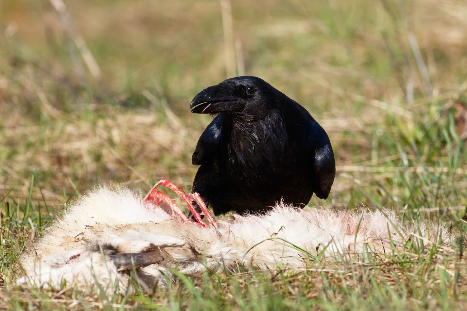 Ravens, known for their intelligence, often seem to anticipate hunts. They follow the wolves and arrive within moments of a kill, sometimes even before the wolves have finished. A single raven can eat or stash several pounds of meat in a day, and a large flock can strip a carcass quickly.